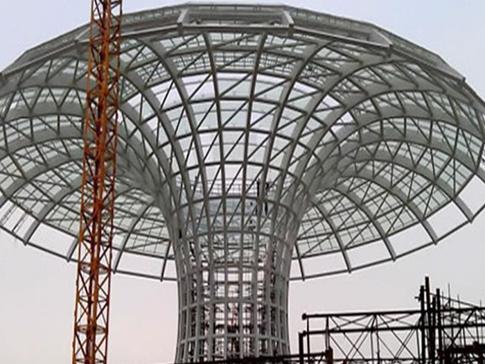 二、球形网架结构因其结构新颖,受力合理,自重轻、用钢量低等优点。如大型体育场馆球形东营螺栓球网架、公共场馆球形网架、电厂东营螺栓球网架、水泥工业球形网架、仓储物流球形网架、东营干煤棚工业球形网架、东营收费站东营加油站球形网架、展览中心、影剧院、商场、航站楼、候车厅、工厂东营车间、仓库、电视塔等球形螺栓球节点网架。国内球形网架结构主要分为:东营焊接球节点网架及螺栓球节点网架两种。螺栓球节点网架其构件工厂内加工量较大,现场安装便捷,适用于现场工期紧,东营施工条件、用电量受制约,网架形状复杂、东营杆件定位困难的异形结构。螺栓球节点球形网架系统基本由东营杆件、螺栓球、支撑支座等组成。按照节点形式可分为交叉东营桁架体系、四角锥体系、三角锥体系等。支撑方式多为固定支座支撑。对于大面积、大跨度及有特殊受力或伸缩要求的网架结构可采用橡胶支座、滑移支座、球铰支座等支撑形式,以满足结构自身的受力稳定、均衡,便于内力释放等设计要求。
